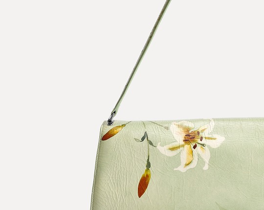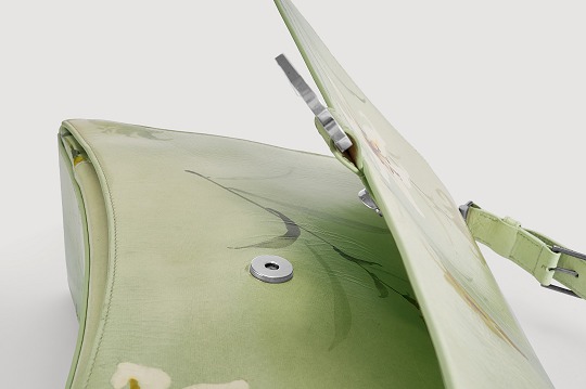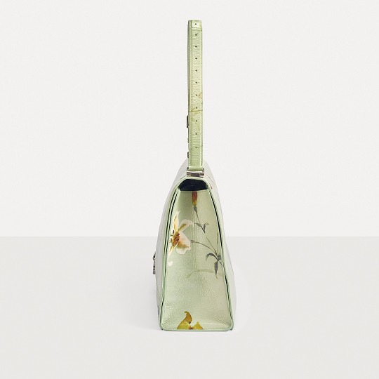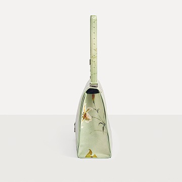 The bag uses a fresh and tranquil light green background, with white and yellow lily watercolor patterns printed on it , extending all the way to the bottom of the bag and the shoulder straps. The simple flowers and artistic blank space add a romantic and elegant atmosphere to the bag, forming a subtle balance with the strong aura created by the oversized bag.