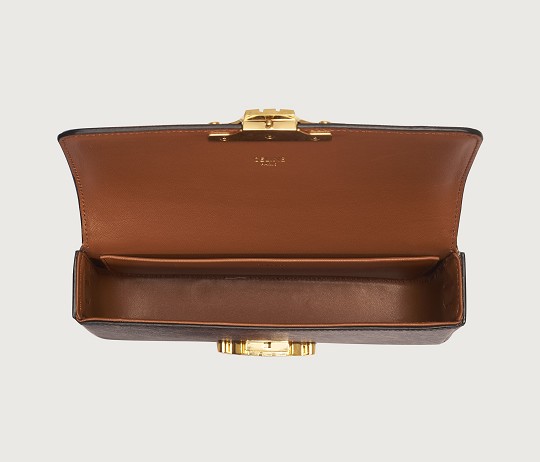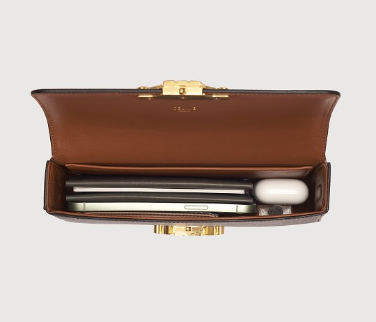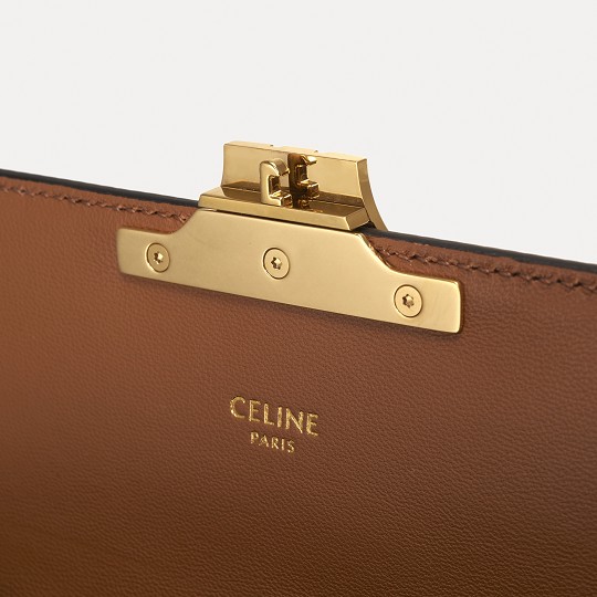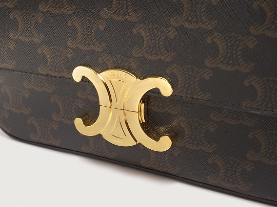 The lock closure adopts a spring buckle design. Just press the buckles on both sides of the double C to unlock it , revealing the small and exquisite CELINE and TRIOMPHE gold-plated logos on the lining .