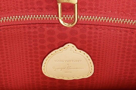 The bag is lined with red cotton canvas printed with Yayoi Kusama's iconic pumpkin polka dot pattern . A pumpkin-shaped LOUIS VUITTON × Yayoi kusama 2023 embossed leather label is sewn on the back zipper pocket, indicating the artist collaboration of this bag. The metal hook enhances security.