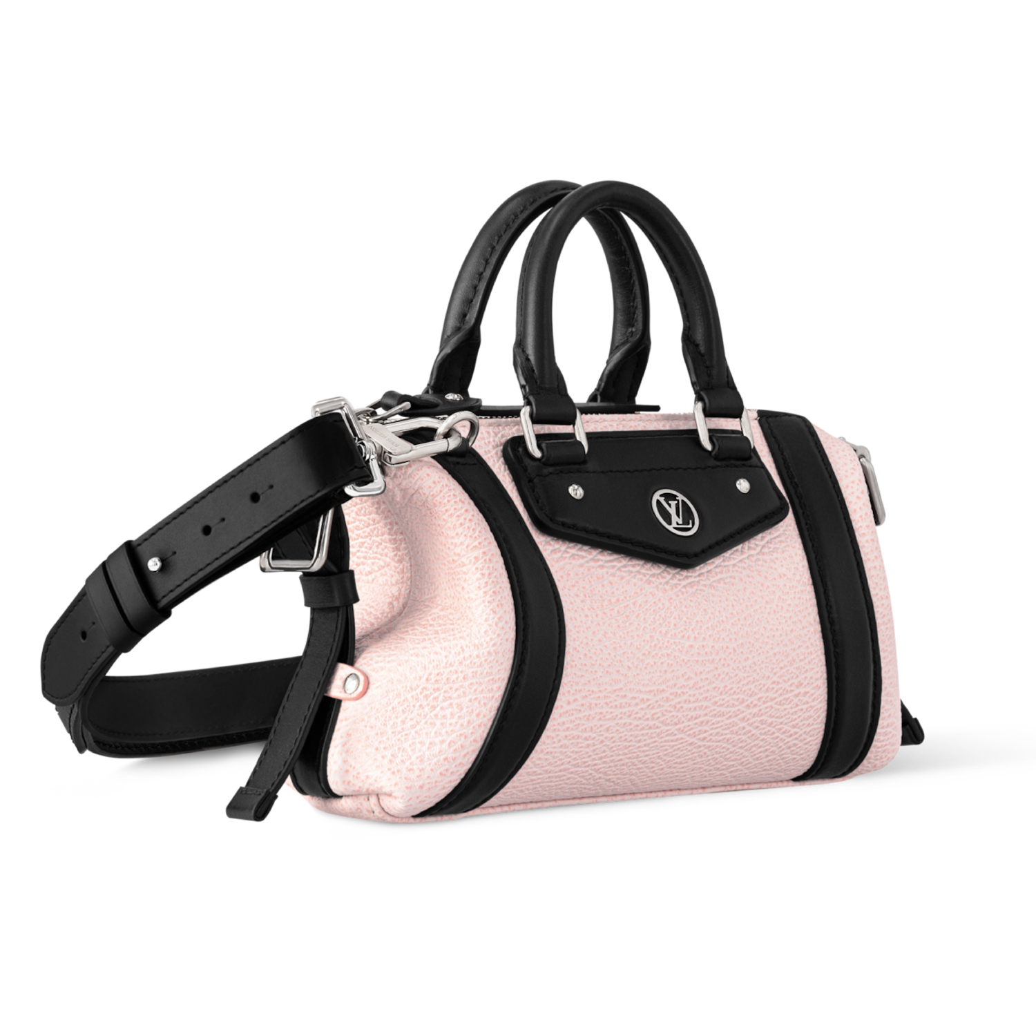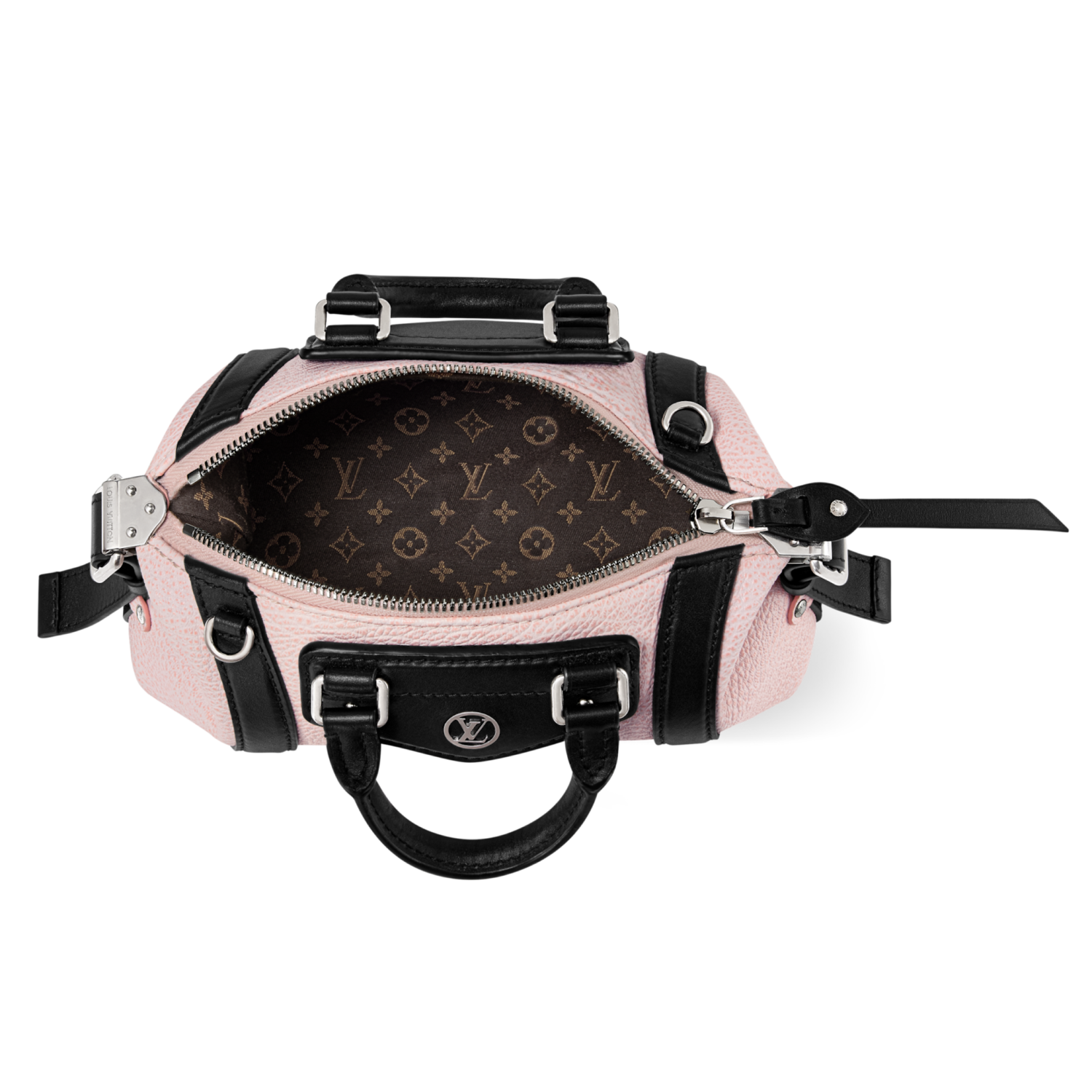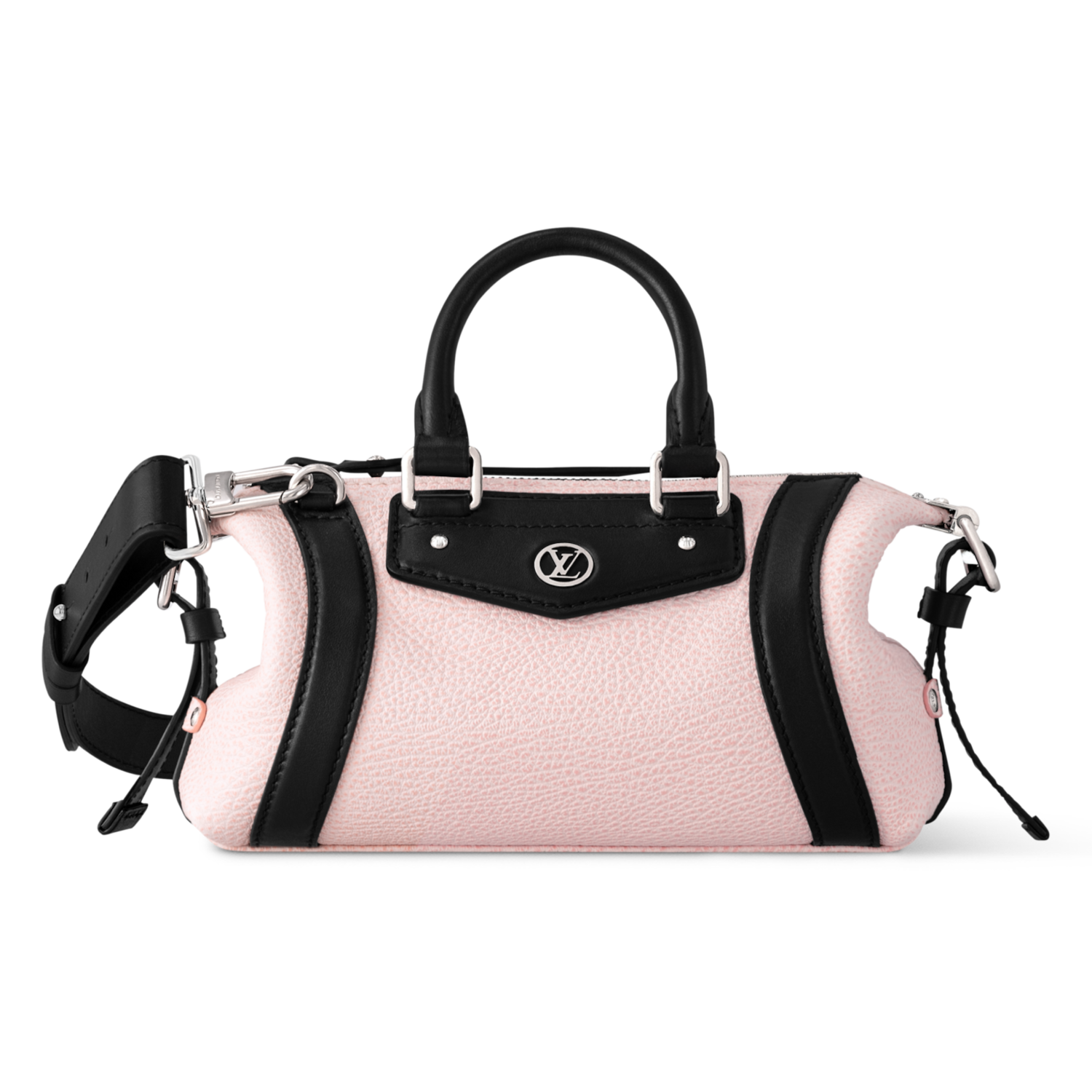 The "LV Biker" handbag is available in a new Nano size. The soft and foldable body structure pays tribute to the functional characteristics of the Speedy and Keepall handbags . The leather straps and triangular trims are inspired by motorcycle jackets, and the LV ring logo and rivets pay tribute to the brand's box-making craftsmanship. The bag is made of newly developed Pixel lambskin , which is rendered in a soft jasmine pink , showing a temperament that combines strength and softness.