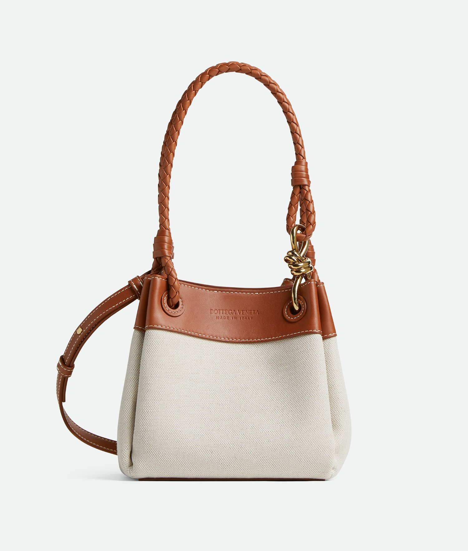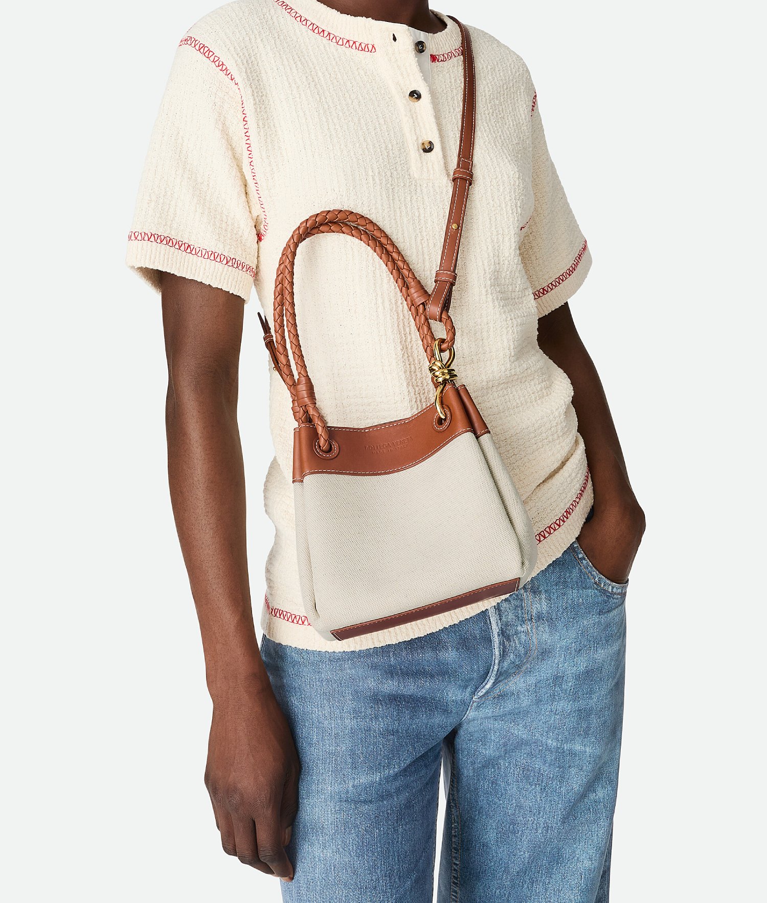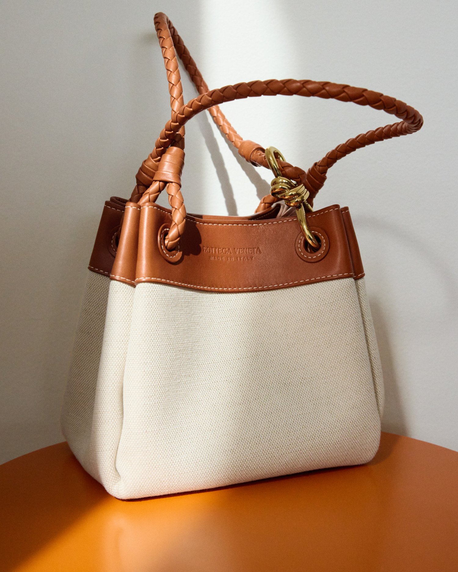 The BV Parachute bag has a three-dimensional, square silhouette, and the handle is made of classic Intrecciato woven leather, with a metal knot element at the joint , integrating exquisite craftsmanship into daily life. The new bag is made of lightweight and portable canvas fabric , spliced with saddle-colored glossy calfskin, exuding a casual and relaxed style.