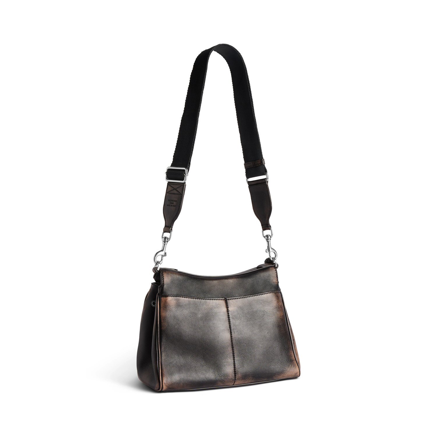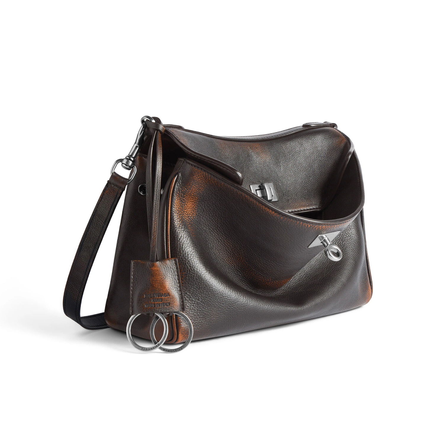 Balenciaga's Fall 25 collection introduces the Rodeo messenger bag , which continues the iconic double-opening design and is paired with a detachable wide fabric shoulder strap . The highlight is that the bag is made of distressed textured calfskin , rendered in a vintage dark brown tone with mottled light brown . The deliberately faded texture injects an antique-like mark of time into the handbag.
