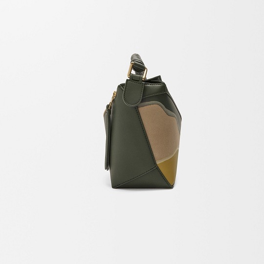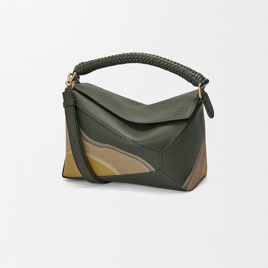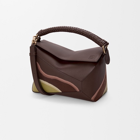 The small Puzzle Edge handbag is available in three colors: walnut/parrot pink, chocolate/light moss, and aquarius green/ochre. The bag is made of Nappa cowhide leather and suede . Craftsmen need to cut leather of different colors and thin the edges, and then use a machine to stack the pieces together to achieve the same thickness. The naturally extended lines and textures are like the rock structure formed by the movement of the earth's crust, which is a tribute to the power of nature. The braided leather handles in the same color add ingenuity to the bag.