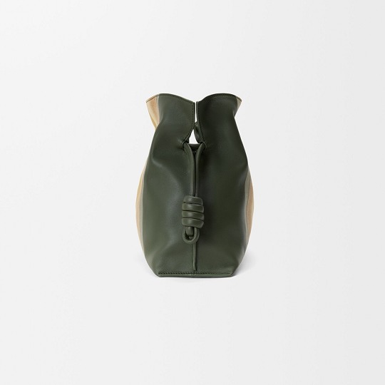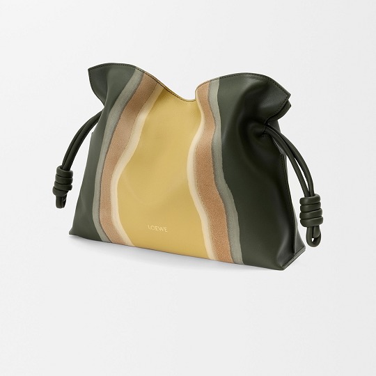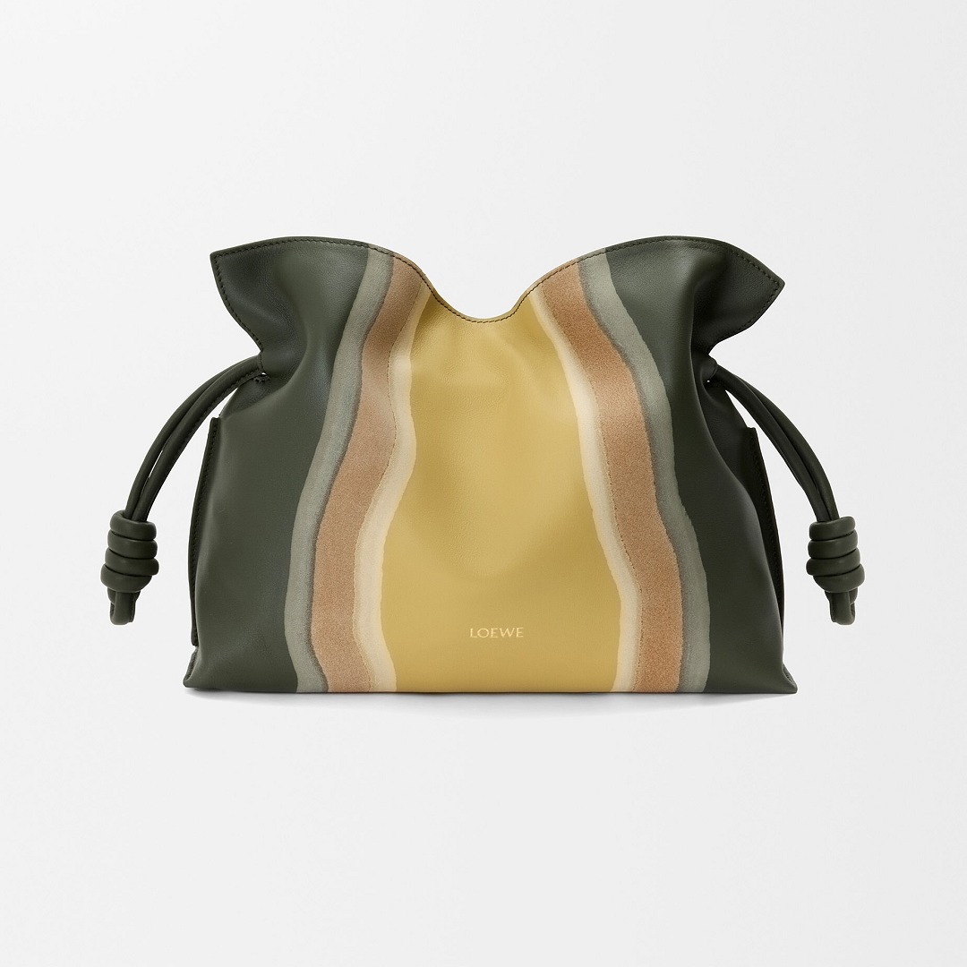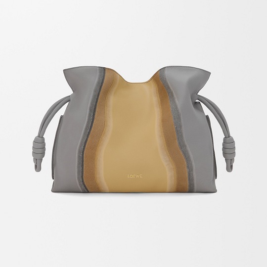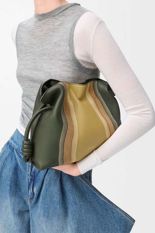 The medium Flamenco handbag incorporates vertical color matching textures into the symmetrical bag shape, just like the sedimentary rock texture formed by water erosion, which complements the natural folds of the bag shape. The knot decorations on both sides add a smart atmosphere to the bag. It is available in four colors: Aquarius Green/Ochre Yellow, Chocolate/Light Moss, Walnut/Parrot Pink and Shiny Gray/Butter .