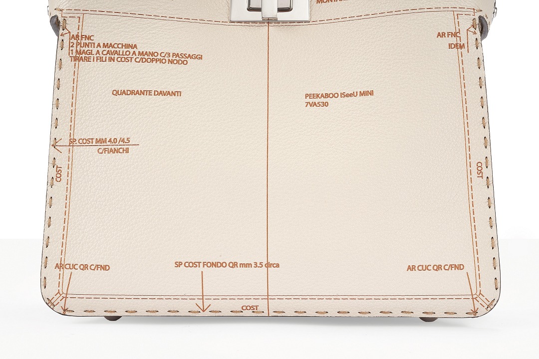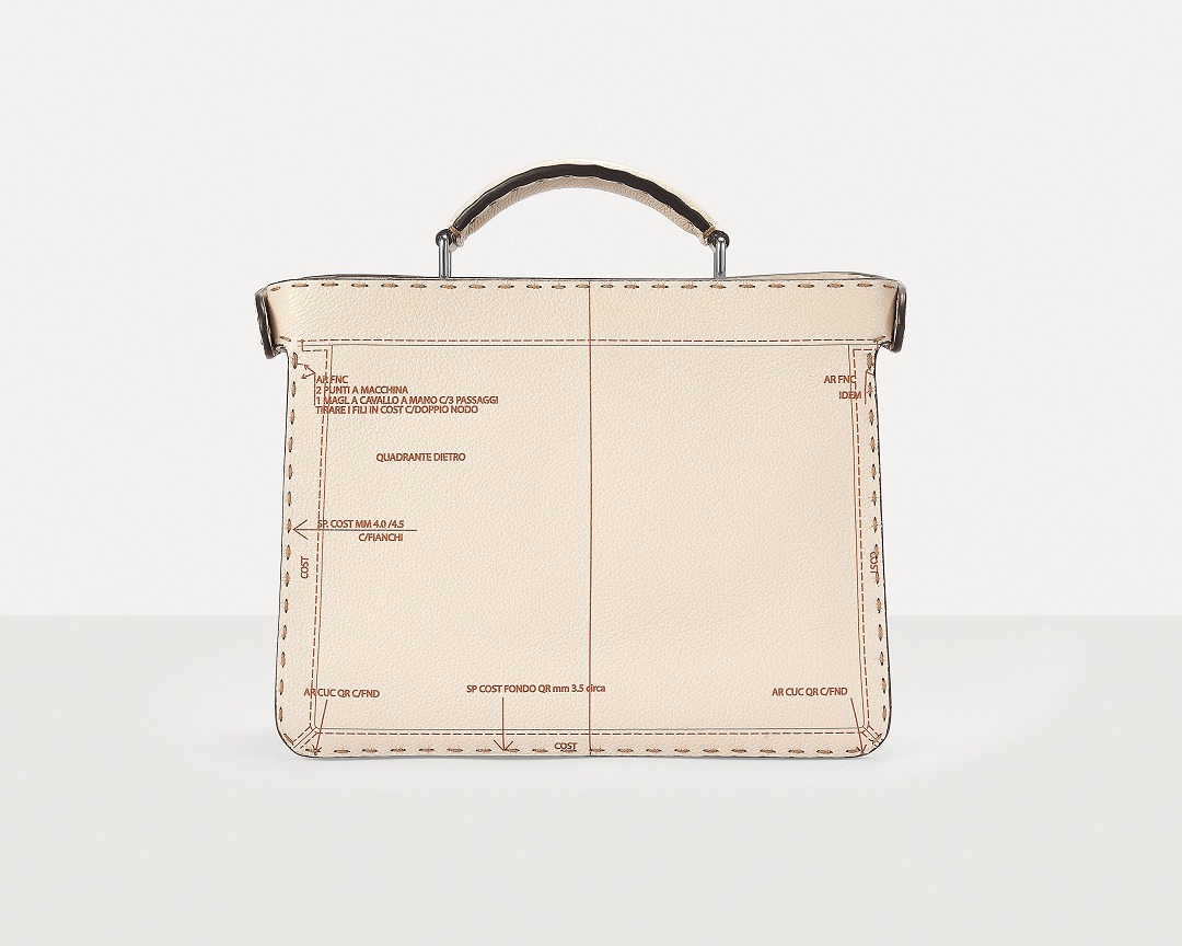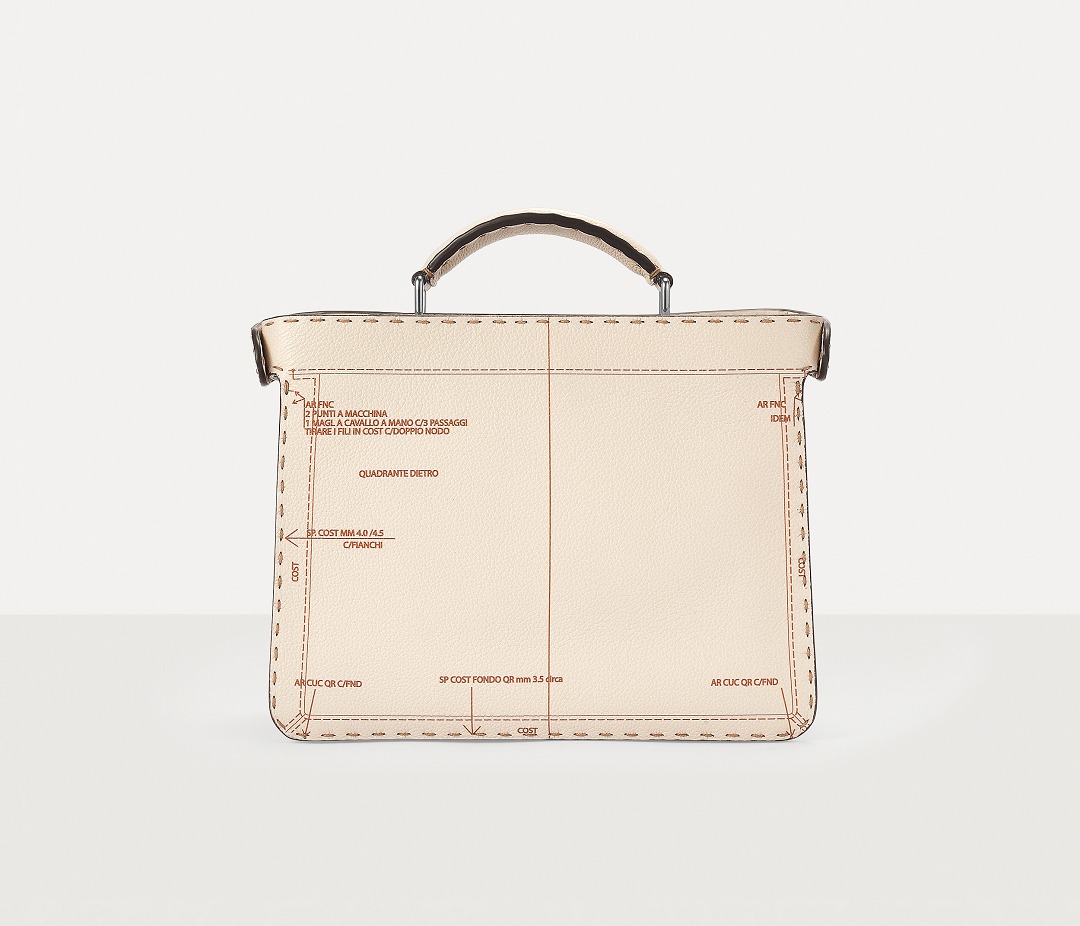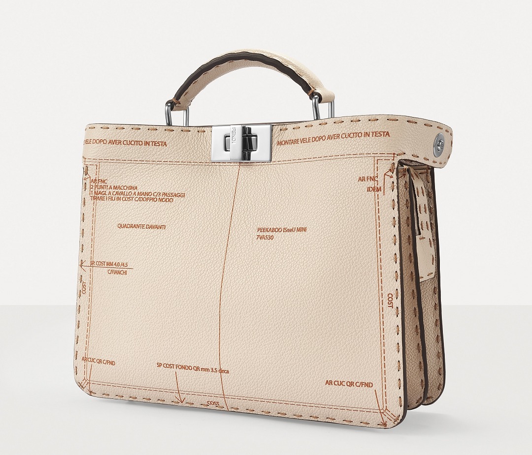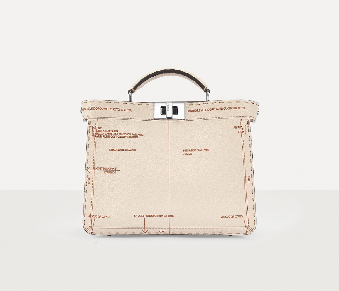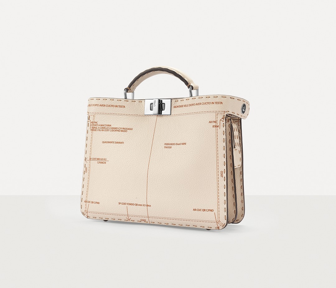 This Peekaboo ISeeU mini handbag is from the FENDI 2024 Spring/Summer Men's Collection. It uses camellia white grained cowhide leather to shape a refined briefcase silhouette. The printed pattern is inspired by the precise plate-making sketches of the FENDI Factory leather workshop , paying tribute to the ingenuity and professional skills of Italian craftsmen.