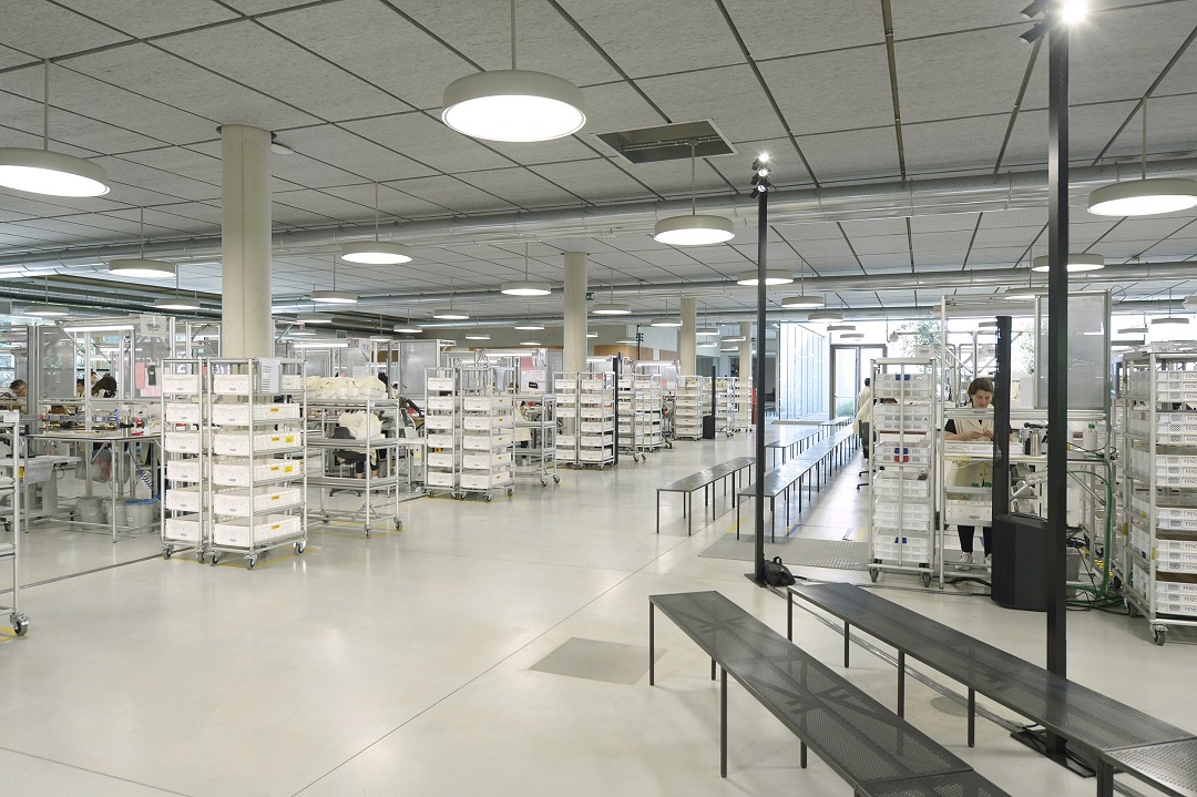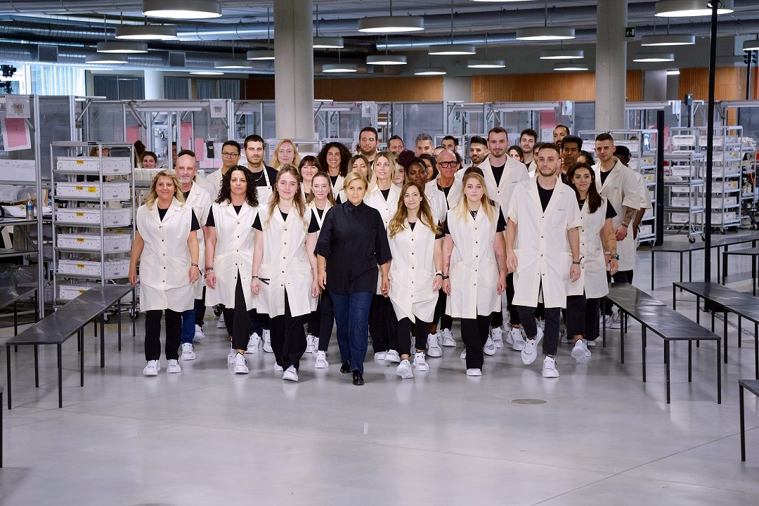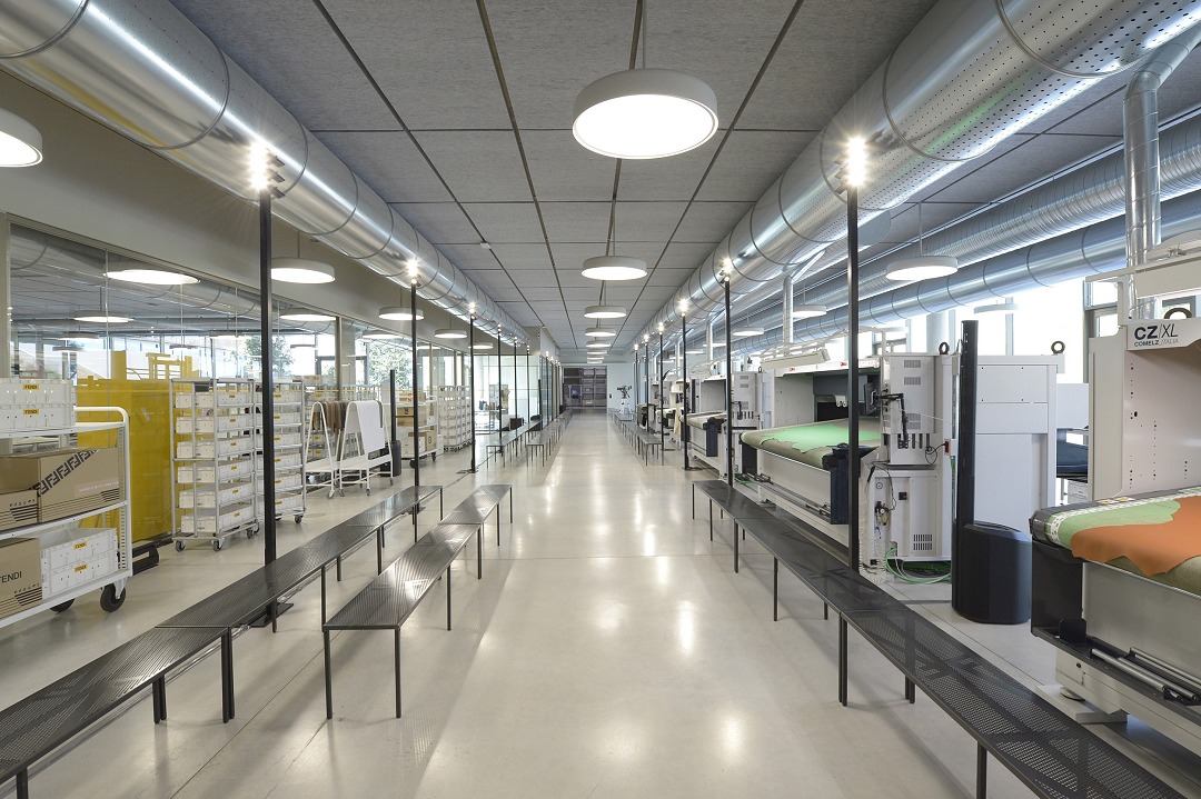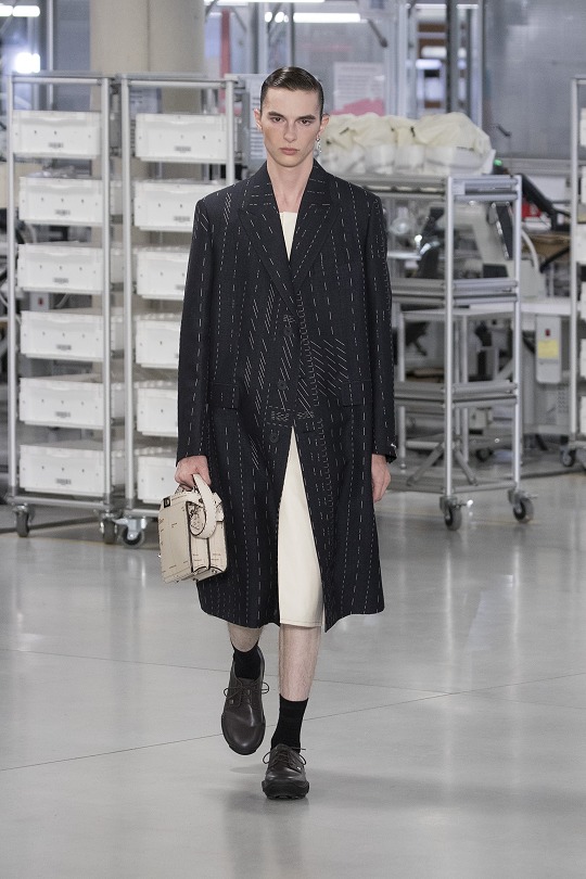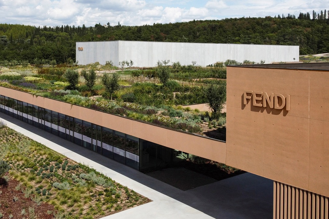 The FENDI Factory leather goods workshop located in the Tuscan countryside was completed and opened in October 2022. The workshop covers an area of 8 hectares and adopts earth-tone concrete exterior walls that echo the surrounding environment. Surrounded by newly planted olive trees and local vegetation, it blends in with the mountain vegetation. This season's men's show uses the workshop atrium as the T stage, and models shuttle between the craftsmen's workbenches, presenting the eternal fusion of mechanical products and handicrafts.